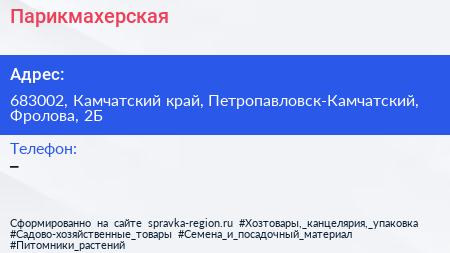 Парикмахерская по адресу 683002, Камчатский край, Петропавловск-Камчатский, Фролова, 2Б в дальнейшем Организация, размещена в следующих категориях: