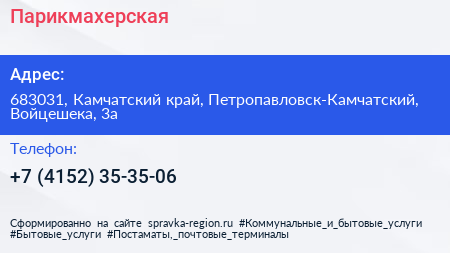 Парикмахерская по адресу 683031, Камчатский край, Петропавловск-Камчатский, Войцешека, 3а в дальнейшем Организация, размещена в следующих категориях: