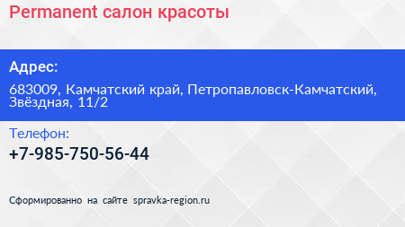 Permanent, салон красоты по адресу 683009, Камчатский край, Петропавловск-Камчатский, Звёздная, 11/2 в дальнейшем Организация, размещена в следующих категориях: