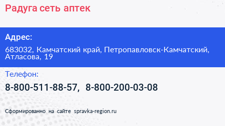 Радуга, сеть аптек по адресу 683032, Камчатский край, Петропавловск-Камчатский, Атласова, 19 в дальнейшем Организация, размещена в следующих категориях:
