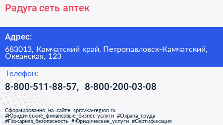 Радуга, сеть аптек по адресу 683013, Камчатский край, Петропавловск-Камчатский, Океанская, 123 в дальнейшем Организация, размещена в следующих категориях: