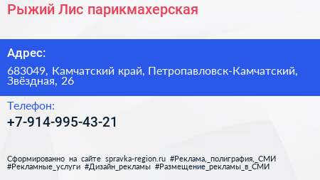 Рыжий Лис, парикмахерская по адресу 683049, Камчатский край, Петропавловск-Камчатский, Звёздная, 26 в дальнейшем Организация, размещена в следующих категориях: