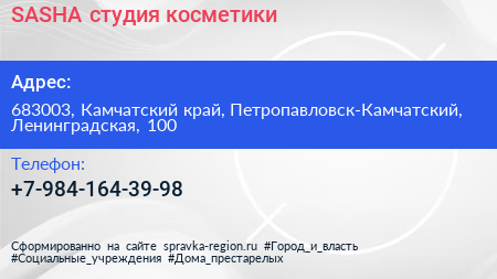 SASHA, студия косметики по адресу 683003, Камчатский край, Петропавловск-Камчатский, Ленинградская, 100 в дальнейшем Организация, размещена в следующих категориях: