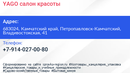 YAGO, салон красоты по адресу 683024, Камчатский край, Петропавловск-Камчатский, Владивостокская, 41 в дальнейшем Организация, размещена в следующих категориях:
