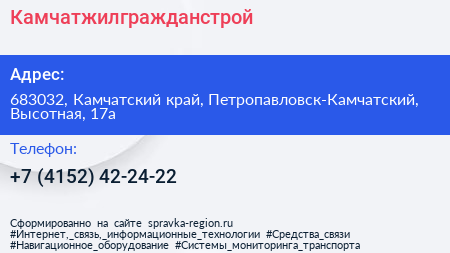 Камчатжилгражданстрой по адресу 683032, Камчатский край, Петропавловск-Камчатский, Высотная, 17а в дальнейшем Организация, размещена в следующих категориях: