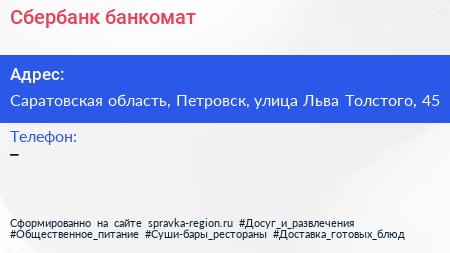 Сбербанк, банкомат по адресу Саратовская область, Петровск, улица Льва Толстого, 45 в дальнейшем Организация, размещена в следующих категориях: