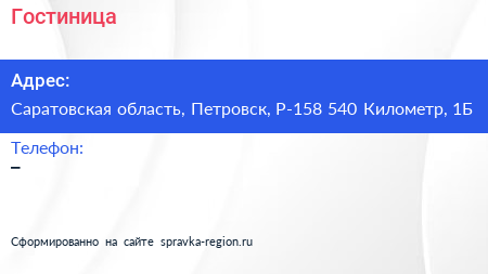Гостиница по адресу Саратовская область, Петровск, Р-158 540 Километр, 1Б в дальнейшем Организация, размещена в следующих категориях: