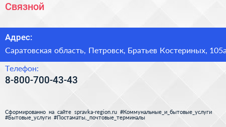 Связной по адресу Саратовская область, Петровск, Братьев Костериных, 105а в дальнейшем Организация, размещена в следующих категориях: