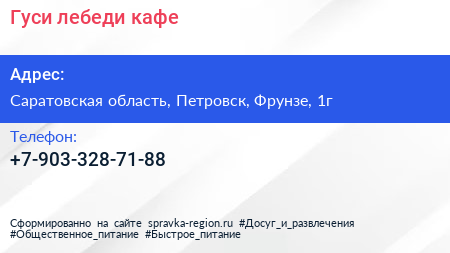 Гуси лебеди, кафе по адресу Саратовская область, Петровск, Фрунзе, 1г в дальнейшем Организация, размещена в следующих категориях: