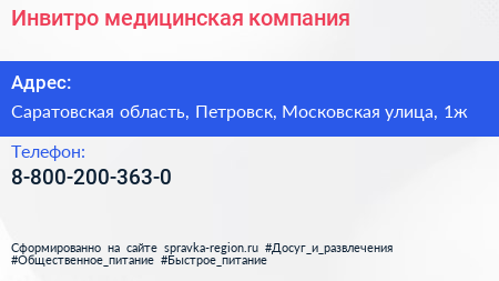 Инвитро, медицинская компания по адресу Саратовская область, Петровск, Московская улица, 1ж в дальнейшем Организация, размещена в следующих категориях: