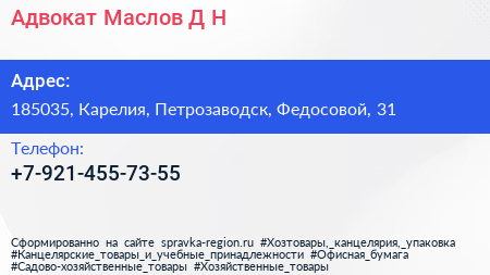 Адвокат Маслов Д.Н. по адресу 185035, Карелия, Петрозаводск, Федосовой, 31 в дальнейшем Организация, размещена в следующих категориях: