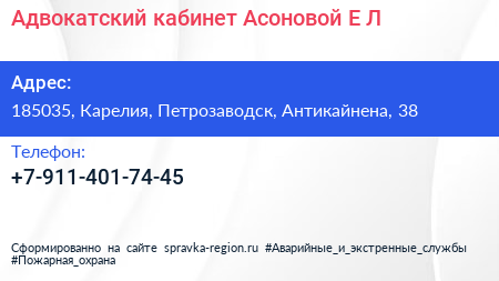Адвокатский кабинет Асоновой Е.Л. по адресу 185035, Карелия, Петрозаводск, Антикайнена, 38 в дальнейшем Организация, размещена в следующих категориях: