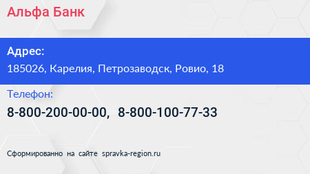 Альфа-Банк по адресу 185026, Карелия, Петрозаводск, Ровио, 18 в дальнейшем Организация, размещена в следующих категориях: