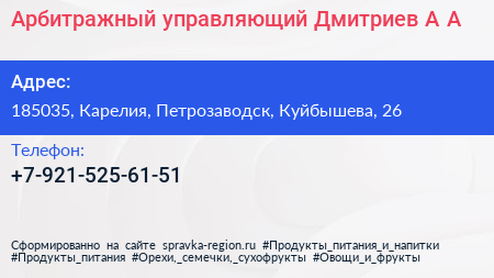Арбитражный управляющий Дмитриев А.А. по адресу 185035, Карелия, Петрозаводск, Куйбышева, 26 в дальнейшем Организация, размещена в следующих категориях: