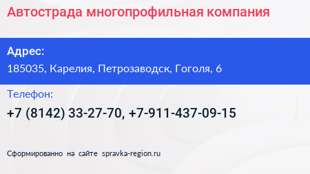 Автострада, многопрофильная компания по адресу 185035, Карелия, Петрозаводск, Гоголя, 6 в дальнейшем Организация, размещена в следующих категориях: