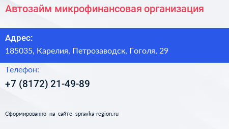 Автозайм, микрофинансовая организация по адресу 185035, Карелия, Петрозаводск, Гоголя, 29 в дальнейшем Организация, размещена в следующих категориях: