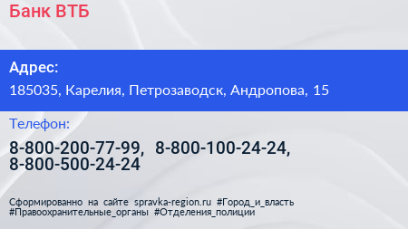 Банк ВТБ по адресу 185035, Карелия, Петрозаводск, Андропова, 15 в дальнейшем Организация, размещена в следующих категориях: