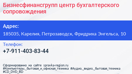 Бизнесфинансгрупп, центр бухгалтерского сопровождения по адресу 185035, Карелия, Петрозаводск, Фридриха Энгельса, 10 в дальнейшем Организация, размещена в следующих категориях: