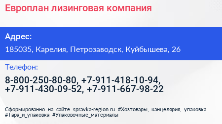 Европлан, лизинговая компания по адресу 185035, Карелия, Петрозаводск, Куйбышева, 26 в дальнейшем Организация, размещена в следующих категориях: