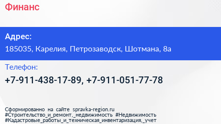 Финанс по адресу 185035, Карелия, Петрозаводск, Шотмана, 8а в дальнейшем Организация, размещена в следующих категориях: