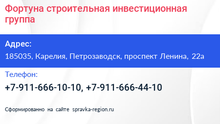 Фортуна, строительная инвестиционная группа по адресу 185035, Карелия, Петрозаводск, проспект Ленина, 22а в дальнейшем Организация, размещена в следующих категориях: