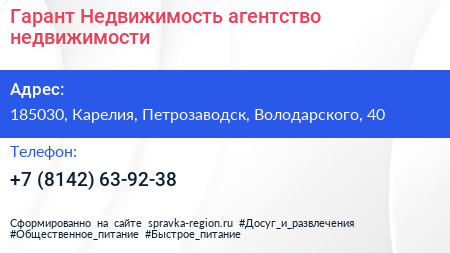 Гарант-Недвижимость, агентство недвижимости по адресу 185030, Карелия, Петрозаводск, Володарского, 40 в дальнейшем Организация, размещена в следующих категориях: