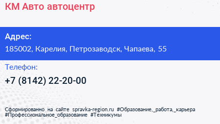 КМ-Авто, автоцентр по адресу 185002, Карелия, Петрозаводск, Чапаева, 55 в дальнейшем Организация, размещена в следующих категориях: