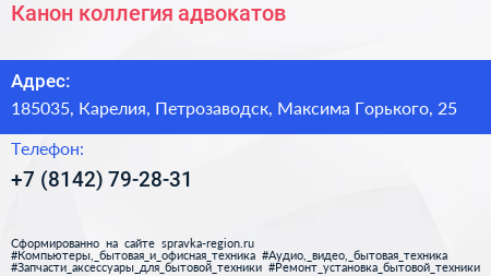 Канон, коллегия адвокатов по адресу 185035, Карелия, Петрозаводск, Максима Горького, 25 в дальнейшем Организация, размещена в следующих категориях: