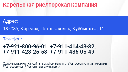 Карельская риелторская компания по адресу 185035, Карелия, Петрозаводск, Куйбышева, 11 в дальнейшем Организация, размещена в следующих категориях: