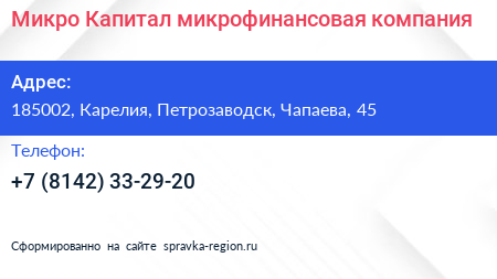 Микро Капитал, микрофинансовая компания по адресу 185002, Карелия, Петрозаводск, Чапаева, 45 в дальнейшем Организация, размещена в следующих категориях: