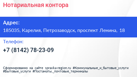 Нотариальная контора по адресу 185035, Карелия, Петрозаводск, проспект Ленина, 18 в дальнейшем Организация, размещена в следующих категориях:
