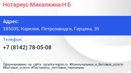 Нотариус Михалкина Н.Б. по адресу 185035, Карелия, Петрозаводск, Герцена, 35 в дальнейшем Организация, размещена в следующих категориях: