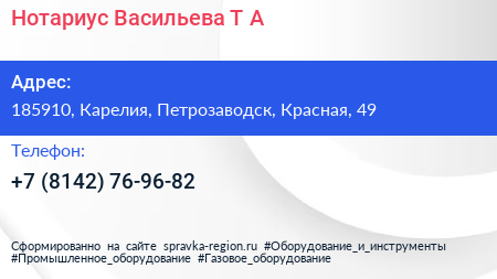 Нотариус Васильева Т.А. по адресу 185910, Карелия, Петрозаводск, Красная, 49 в дальнейшем Организация, размещена в следующих категориях: