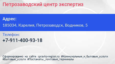 Петрозаводский центр экспертиз по адресу 185034, Карелия, Петрозаводск, Водников, 5 в дальнейшем Организация, размещена в следующих категориях: