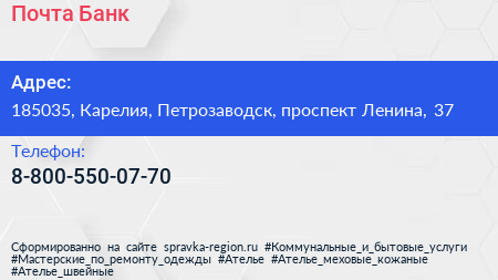 Почта Банк по адресу 185035, Карелия, Петрозаводск, проспект Ленина, 37 в дальнейшем Организация, размещена в следующих категориях: