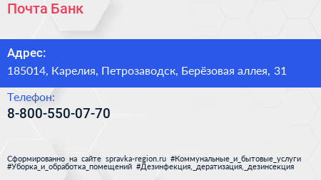 Почта Банк по адресу 185014, Карелия, Петрозаводск, Берёзовая аллея, 31 в дальнейшем Организация, размещена в следующих категориях:
