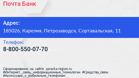 Почта Банк по адресу 185026, Карелия, Петрозаводск, Сортавальская, 11 в дальнейшем Организация, размещена в следующих категориях: