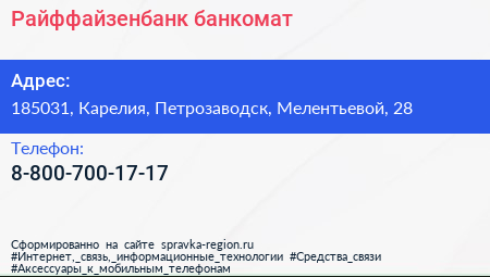 Райффайзенбанк, банкомат по адресу 185031, Карелия, Петрозаводск, Мелентьевой, 28 в дальнейшем Организация, размещена в следующих категориях:
