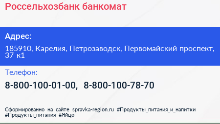 Россельхозбанк, банкомат по адресу 185910, Карелия, Петрозаводск, Первомайский проспект, 37 к1 в дальнейшем Организация, размещена в следующих категориях: