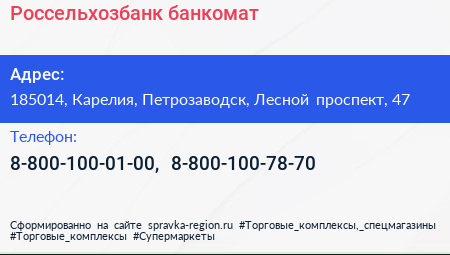 Россельхозбанк, банкомат по адресу 185014, Карелия, Петрозаводск, Лесной проспект, 47 в дальнейшем Организация, размещена в следующих категориях: