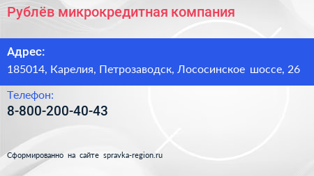 Рублёв, микрокредитная компания по адресу 185014, Карелия, Петрозаводск, Лососинское шоссе, 26 в дальнейшем Организация, размещена в следующих категориях: