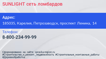 SUNLIGHT, сеть ломбардов по адресу 185035, Карелия, Петрозаводск, проспект Ленина, 14 в дальнейшем Организация, размещена в следующих категориях: