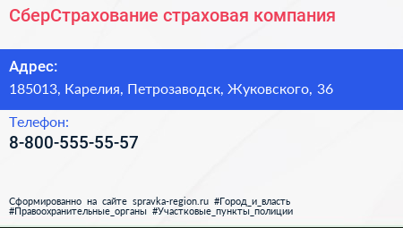 СберСтрахование, страховая компания по адресу 185013, Карелия, Петрозаводск, Жуковского, 36 в дальнейшем Организация, размещена в следующих категориях: