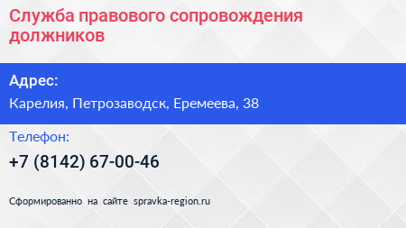 Служба правового сопровождения должников по адресу Карелия, Петрозаводск, Еремеева, 38 в дальнейшем Организация, размещена в следующих категориях:
