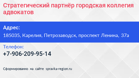 Стратегический партнёр, городская коллегия адвокатов по адресу 185035, Карелия, Петрозаводск, проспект Ленина, 37а в дальнейшем Организация, размещена в следующих категориях: