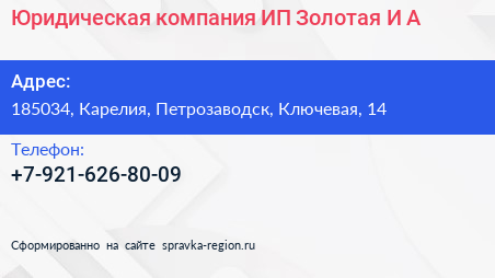 Юридическая компания, ИП Золотая И.А. по адресу 185034, Карелия, Петрозаводск, Ключевая, 14 в дальнейшем Организация, размещена в следующих категориях: