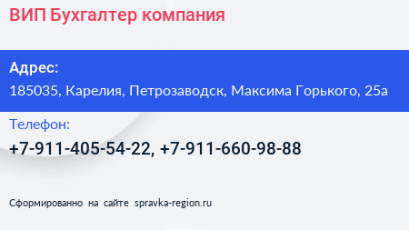 ВИП-Бухгалтер, компания по адресу 185035, Карелия, Петрозаводск, Максима Горького, 25а в дальнейшем Организация, размещена в следующих категориях: