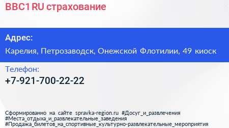 ВВС1.RU-страхование по адресу Карелия, Петрозаводск, Онежской Флотилии, 49 киоск в дальнейшем Организация, размещена в следующих категориях: