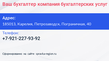 Ваш бухгалтер, компания бухгалтерских услуг по адресу 185013, Карелия, Петрозаводск, Пограничная, 40 в дальнейшем Организация, размещена в следующих категориях: