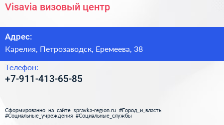 Visavia, визовый центр по адресу Карелия, Петрозаводск, Еремеева, 38 в дальнейшем Организация, размещена в следующих категориях:
